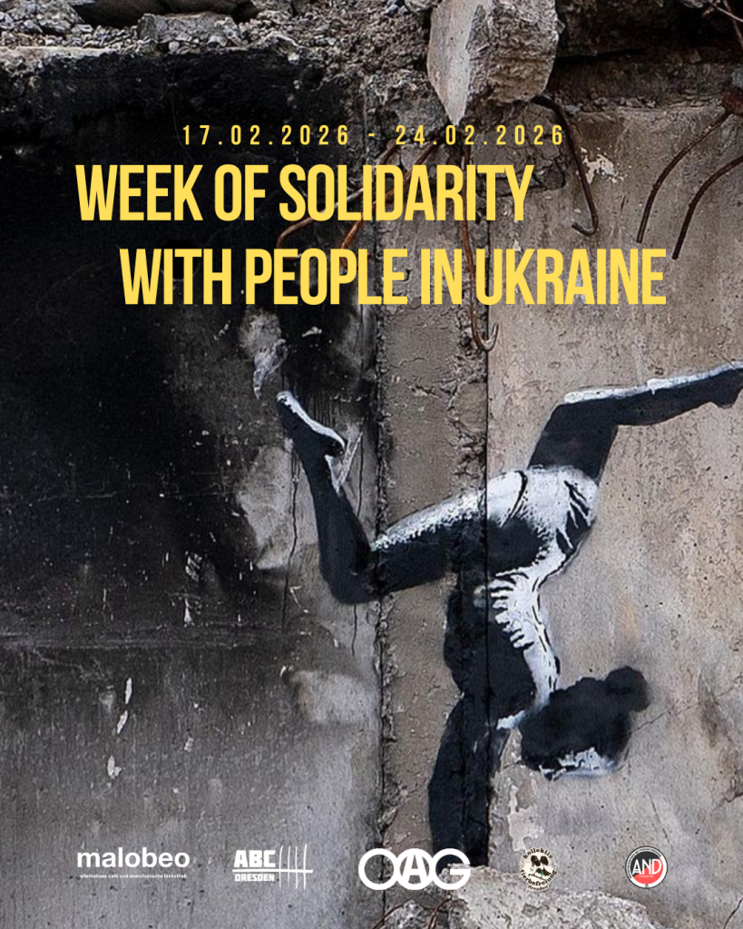 Mit dem 24. Februar 2026 beginnt das 5. Kriegsjahr des russischen Angriffskriegs auf die Ukraine. Was das für das Leben der Menschen in der Ukraine bedeutet, ist für die meisten Menschen hier unvorstellbar. Seit Wochen herrschen Minusgrade. Durch andauernde russische Angriffe mit Drohnen und ballistischen Waffen auf die Energieinfrastruktur gibt… Week of Solidarity with people in Ukraine weiterlesen - 20.02.-06.03. Aktionswochen für den Anti-Autoritären Widerstand in der Ukraine