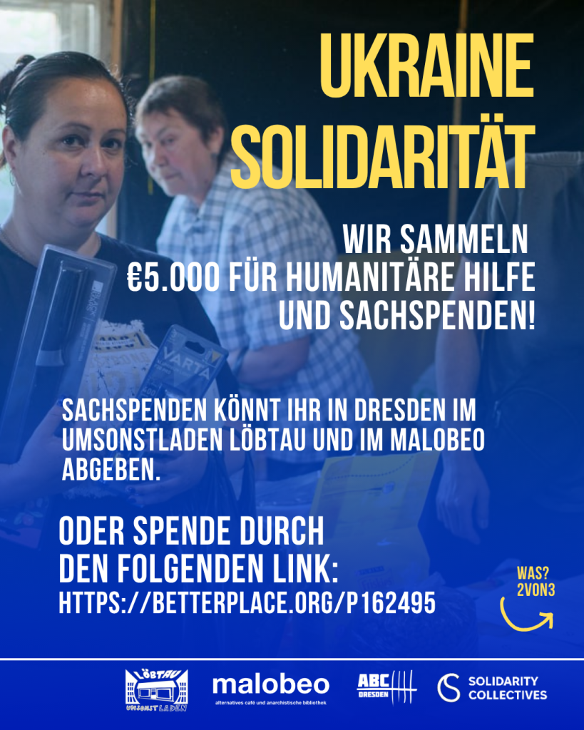 Wir sammeln€5.000 für humanitäre Hilfeund Sachspenden! Sachspenden könnt ihr in Dresden im Umsonstladen Löbtau und im Malobeo abgeben. Umsonstladen Löbtau […]